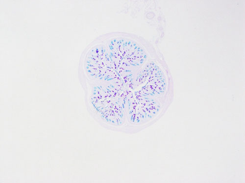 AB-PAS染色,石蜡切片技术里常用的检测肠、胃中酸性和中性粘液物质的染色方法。组织中的糖原、中性粘液物质呈红色,酸性粘液物质呈蓝色,混合性粘液物质呈蓝紫色或紫蓝色。主要用于区分中性和酸性粘液,及二者的比率。有些癌细胞可以通过此染色方法进行区分属于什么性质的癌。