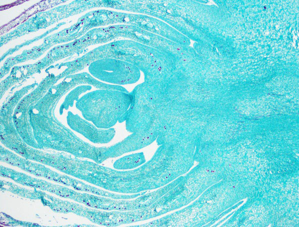 植物番红固绿染色,石蜡切片技术里用观察植物组织的形态结构。韧皮部形成层芽尖根尖分生去等新生组织结构呈绿色,木质化木栓化的结构呈红色(软化后的木质化结构成分流失,结果呈绿色)。
