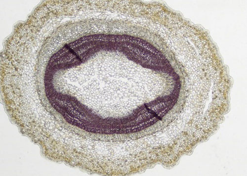 硬组织切片针对未经化学试剂软化的硬组织,能很好地保留木质部结构和成分。间苯三酚反应是植物纤维化学中确定木质化细胞壁的最常用和最简单的方法。这一反应的原理是当间苯三酚在酸性环境下与细胞壁中的木质素相遇时,发生樱桃红色或紫红色反应。